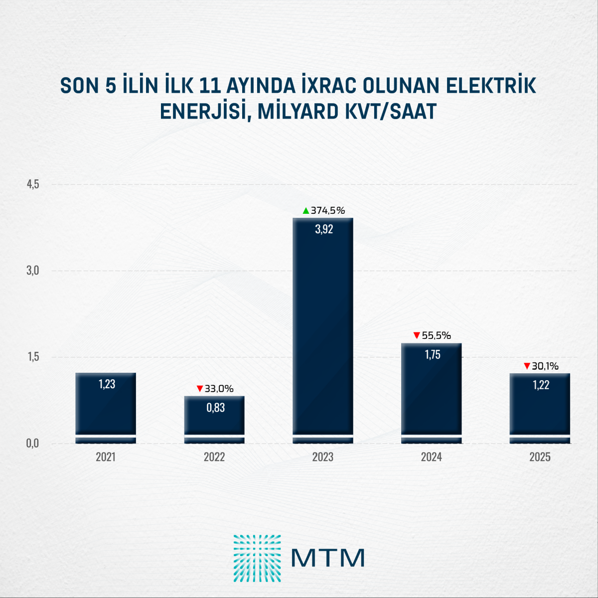 Media Təhlil Mərkəzinin (MTM) Dövlət Gömrük Komitəsinin açıqladığı rəsmi statistik məlumatlar əsasında apardığı təhlilə əsasən, 2025-ci ilin ilk 11 ayı ərzində Azərbaycandan 1,22 milyard kVt/saat elektrik enerjisi ixrac olunub. Müqayisə üçün qeyd edək ki, 2024-cü ilin müvafiq dövründə bu göstərici 1,75 milyard kVt/saat təşkil edib. Beləliklə, ötən ilin ilk 11 ayı ilə müqayisədə elektrik enerjisi ixracında 30,1 faiz və ya 0,53 milyard kVt/saat azalma qeydə alınıb.