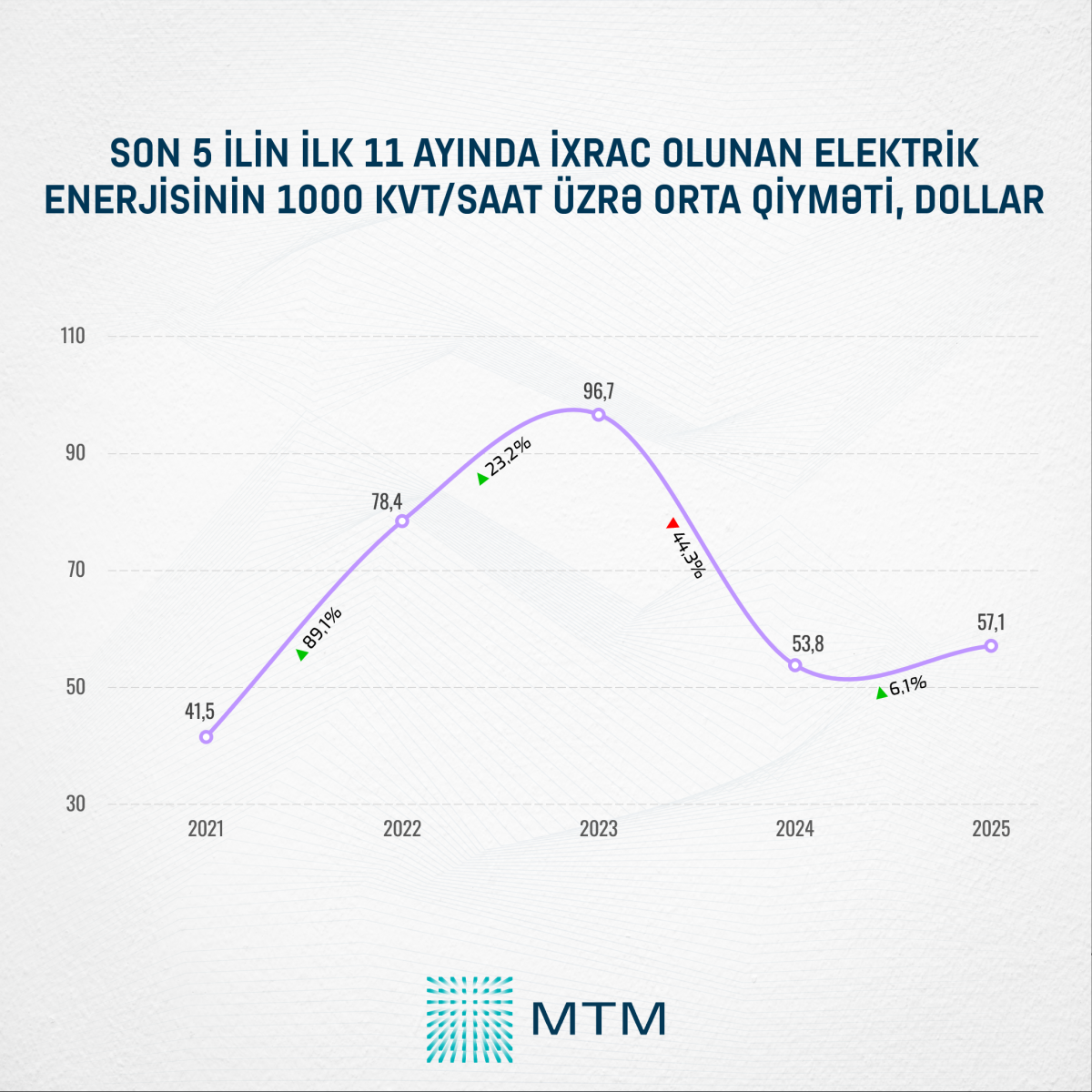Rəsmi statistik məlumatların təhlilinə əsasən, 2025-ci ilin ilk 11 ayı ərzində ixrac olunan elektrik enerjisinin 1000 kVt/saat üzrə orta qiyməti 57,1 ABŞ dolları təşkil edib. Müqayisə üçün qeyd edək ki, 2024-cü ilin müvafiq dövründə bu göstərici 53,8 ABŞ dolları olub. Beləliklə, 2025-ci ildə elektrik enerjisinin ixrac qiymətində 6,1 faiz və ya 3,3 ABŞ dolları artım müşahidə edilib.