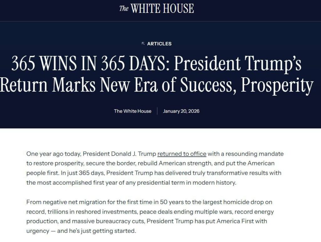 ABŞ administrasiyası Prezident Donald Trampın hakimiyyətdə olduğu 365-ci gün münasibətilə onun “365 qələbəsi” adlı siyahını dərc edib. Sənəddə dövlət başçısının bir il ərzində əldə etdiyi uğurlar sadalanıb.