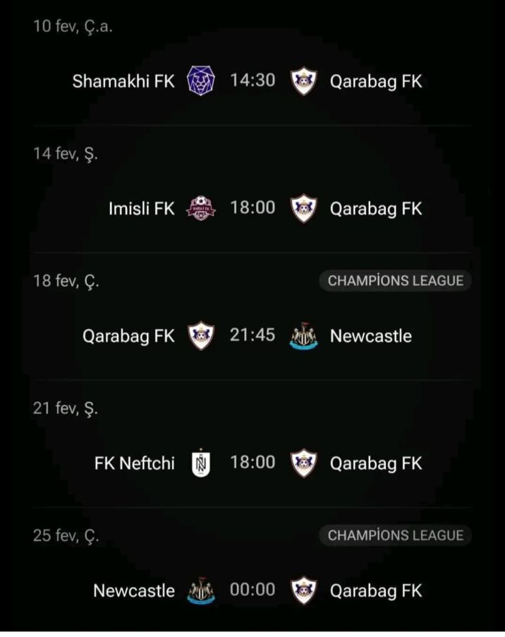 Mia.az xəbər verir ki, fevralın 21-də “Neftçi” “Qarabağ”ı qəbul edir. Oyun saat 19.00-da olacaq. Bundan sonra “Qarabağ” Çempionlar Liqasının pley-off mərhələsinin cavab oyunu üçün İngiltərəyə getməlidi və orada fevralın 24-dən 25-nə keçən gecə oyuna çıxacaq. Bütün bunlara qədər milli çempionatın daha 2 oyunu və “Nyukasl”la ev oyunu da var.