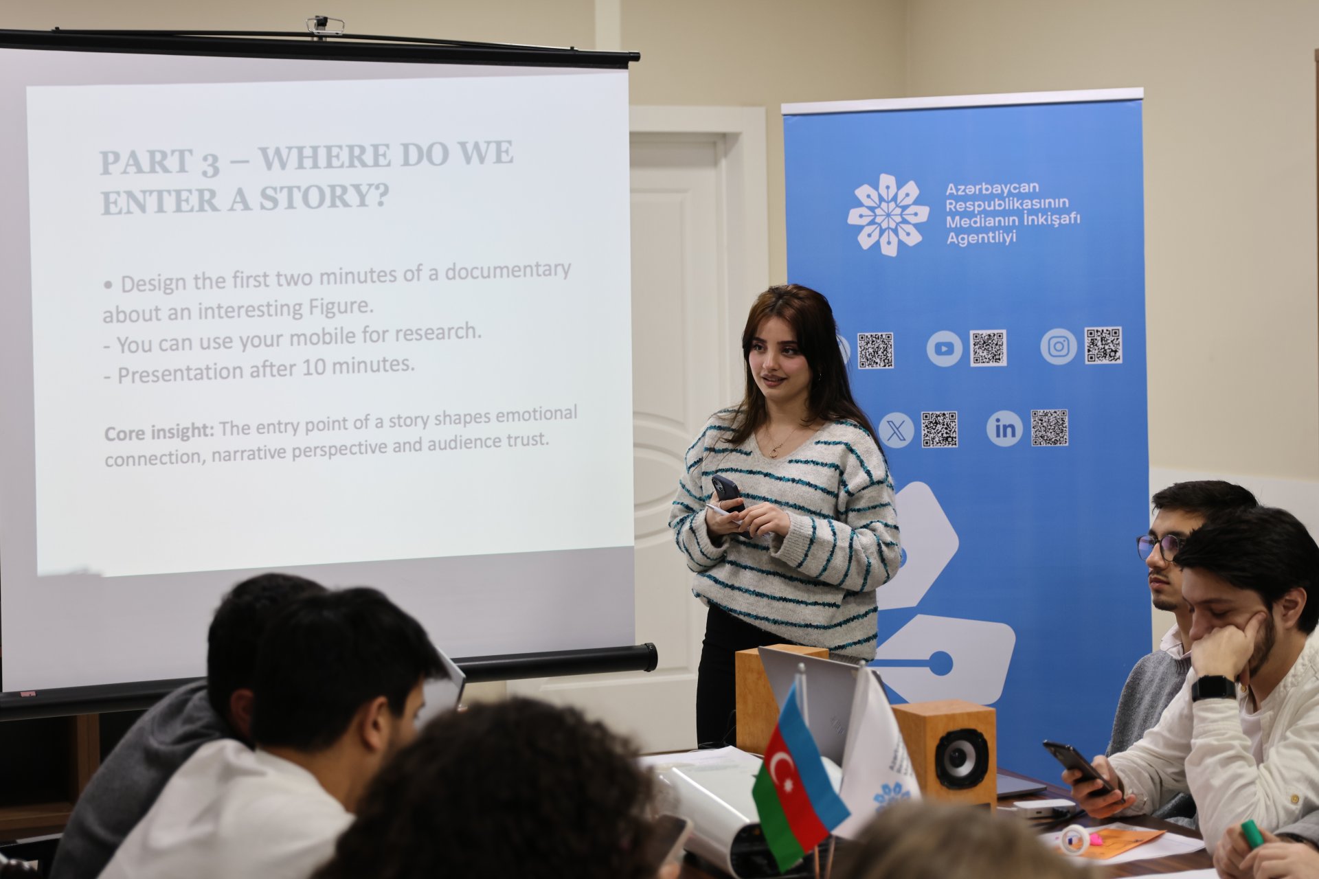Vizual kommunikasiya mütəxəssisi və film rejissoru Antye Dombrovskinin təqdimatında keçilən vörkşop çərçivəsində ümumilikdə altı sessiya təşkil olunub. Sessiyalarda “Müasir multimedia məzmun yaradıcılığına giriş: təcrübə və fikir mübadiləsi”, “Real iş mühitində qərarvermə: peşə terminologiyası, montaj və vizual elementlərin işlənilməsi”, “Hekayəyə giriş: auditoriyanı cəlb edən giriş strategiyaları, emosiya və etibarlılıq”, “Avadanlıqlardan istifadə: kadrlama və perspektivin gücü”, “Vizual materiallarda emosional təsir və etik yanaşma”, eləcə də “Vizual hekayəçilikdə refleksiya və əsas nəticələr” mövzuları müzakirə olunub.
