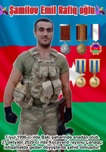 Emilin atası Rafiq Şamilovun xatirələri: “Erməni əsgərlərini qısa vaxt ərzində geri otuzdurublar, ağır itkilərlə geri çəkilən düşmən açıq döyüşdə güc gələ bilmədiyi Emilin vətən eşqi ilə çırpınan ürəyini snayperlə nişan alıb və o, şəhidlik zirvəsinə ucalıb. Axırıncı dəfə ayın 22-si danışdı mənimlə. Ölümündən 4 gün qabaq. O qədər özündən razı danışdı mənimlə. Yoldaşım işdə idi. Dedim, zəng elə. Dedi, nömrəsini bilmirəm, səhər zəng edərəm. Elə o zaman mənimlə danışdı. Ondan sonra da şəhidlik xəbəri gəldi”.