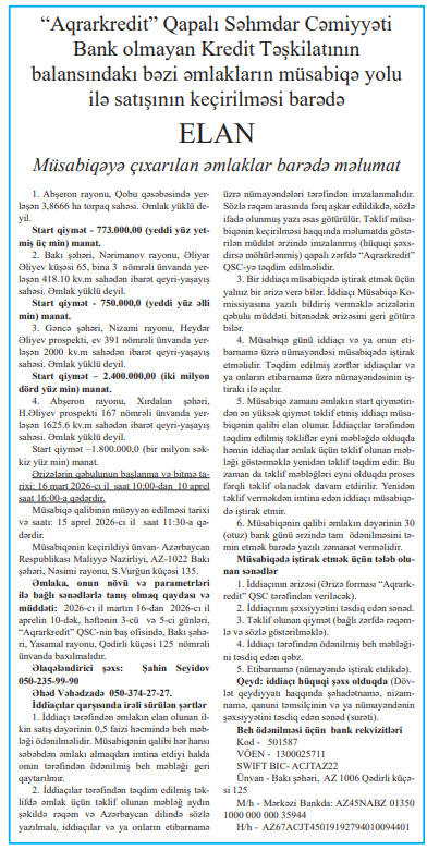 “Aqrarkredit”inbalansındakı bəzi əmlaklar satılır - SİYAHI, QİYMƏTLƏR