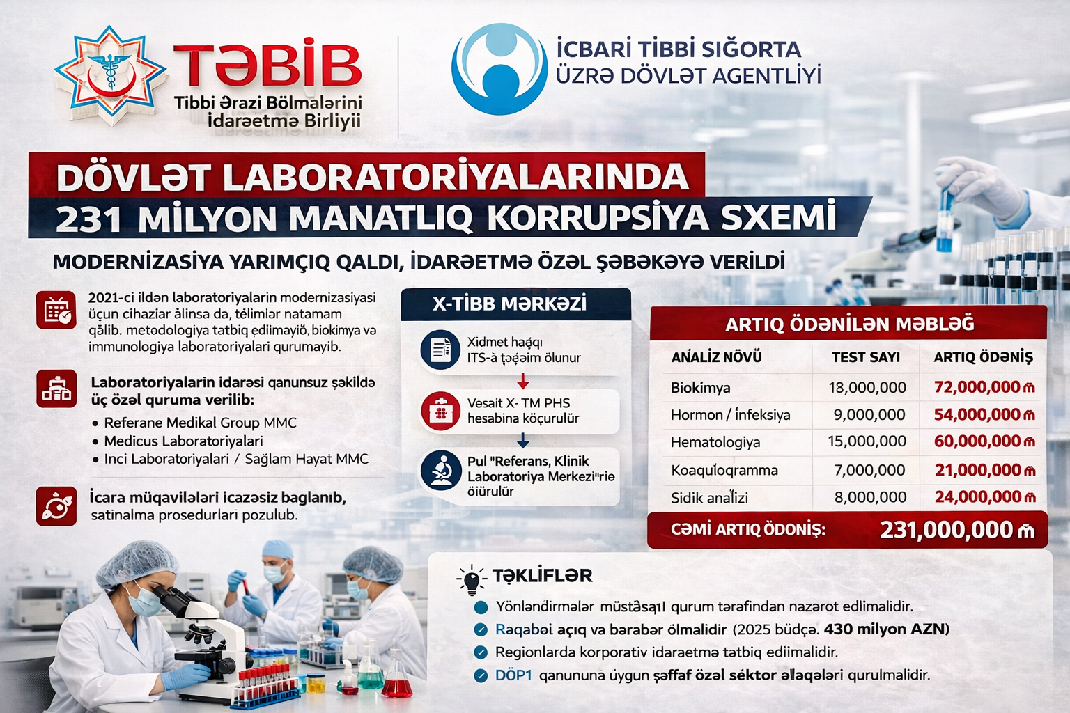 TƏBİB-də kadr dəyişikliyi olduqdan sonra bu və ya  digər səbəblərdən meydana gələn əhalidə  tibb müəssisələrinə qarşı yaranan ciddi narazılıqların “aradan qaldırılması” adı altında dövlət səhiyyə sisteminə daxil olan laboratoriyaların idarəedilməsi qanunvericiliyin tələbləri kobud şəkildə pozularaq özəl müəssisələrin idarəsinə verilib.