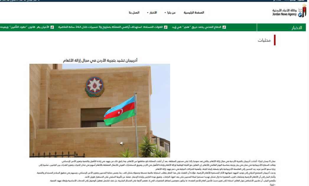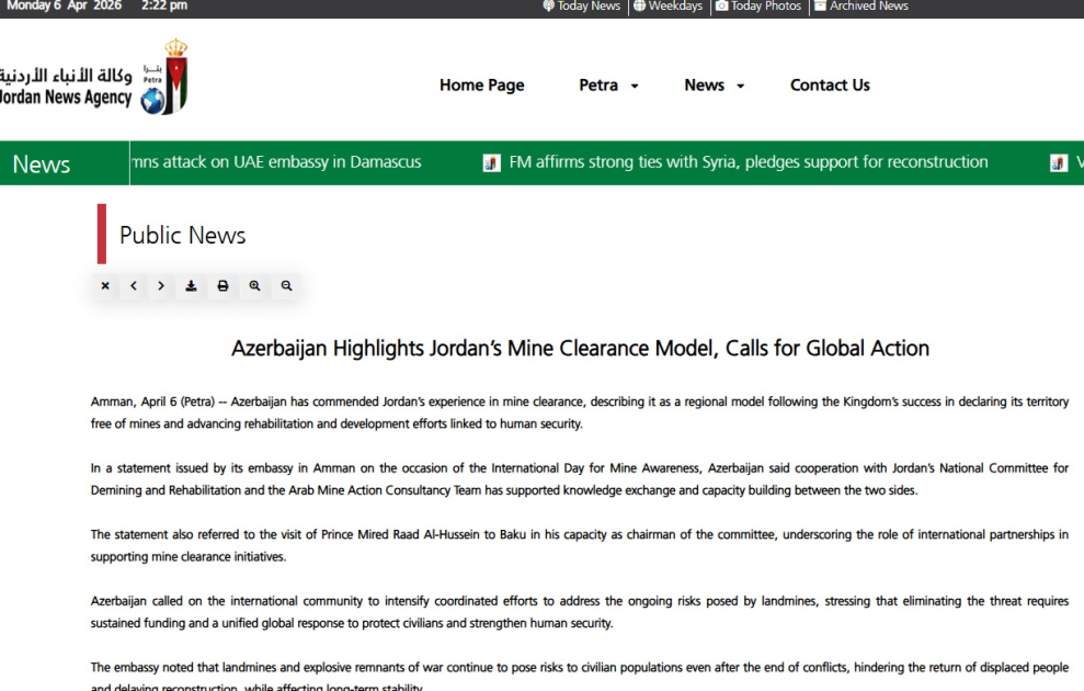 AZƏRTAC xəbər verir ki, bu barədə İordaniyanın PETRA xəbər agentliyinin Azərbaycanın Əmmandakı səfirliyinin Beynəlxalq Mina Xəbərdarlığı və Minatəmizləmə Fəaliyyətinə Yardım Günü ilə əlaqədar yaydığı bəyanata istinadla hazırladığı məqalədə əks olunub.