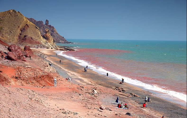 Digər unikal məkanlardan biri "Qırmızı çimərlik”dir. Burada qum tərkibindəki dəmir səbəbindən parlaq qırmızı rəngə malikdir. "Gelak” adlanan bu torpaq hətta yeyilə bilir və yerli mətbəxdə sous və mürəbbələrdə istifadə olunur. Eyni zamanda boya, kosmetika, şüşə və keramika istehsalında da tətbiq edilir. Yağış zamanı su qırmızı rəng alaraq sahildə təsirli mənzərələr yaradır.