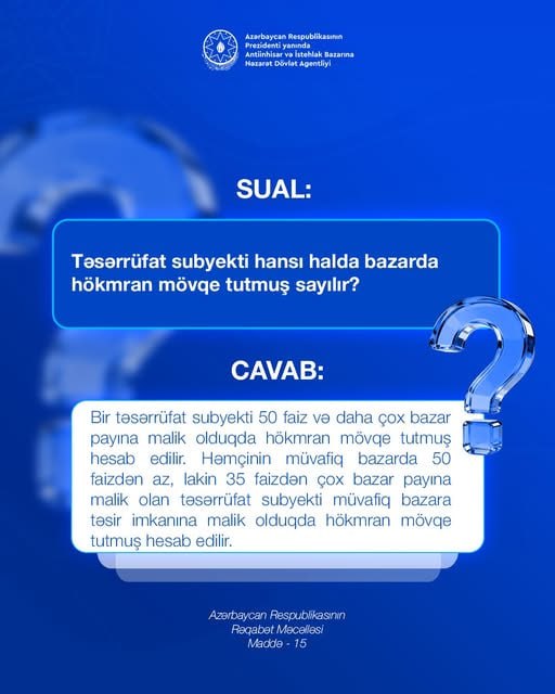 Təsərrüfat subyekti hansı halda bazarda hökmran mövqe tutmuş sayılır?