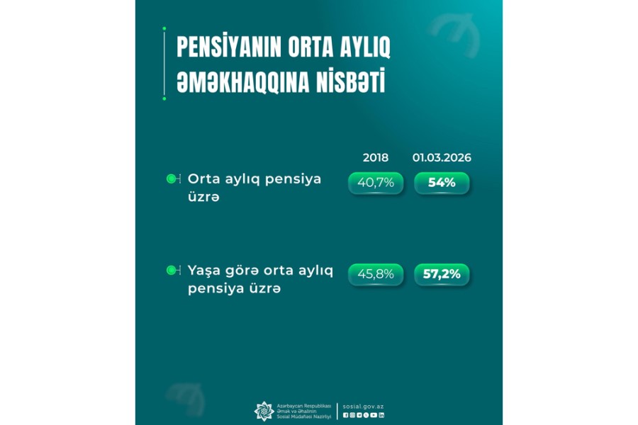 Yaşa görə orta aylıq pensiyanın orta aylıq əməkhaqqına nisbəti 57,2 faizə çatıb