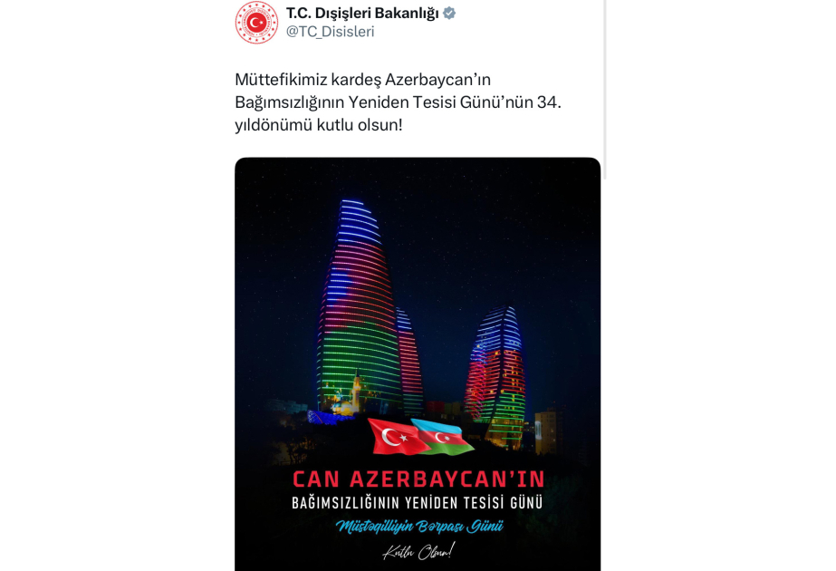 Türkiyə XİN: Qardaş Azərbaycanın Müstəqilliyinin Bərpası Gününün 34-cü ildönümü mübarək olsun