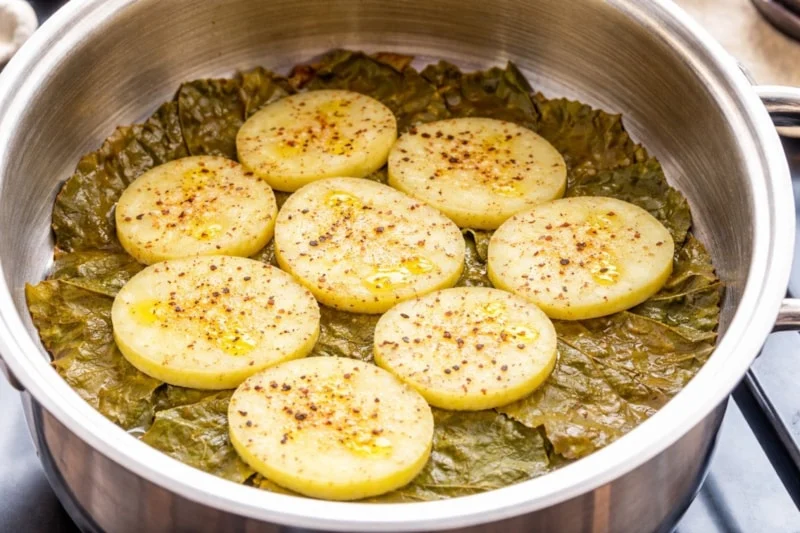 Dolmanın dibinin yapışmaması üçün... -Bir neçə dilim doğrayın