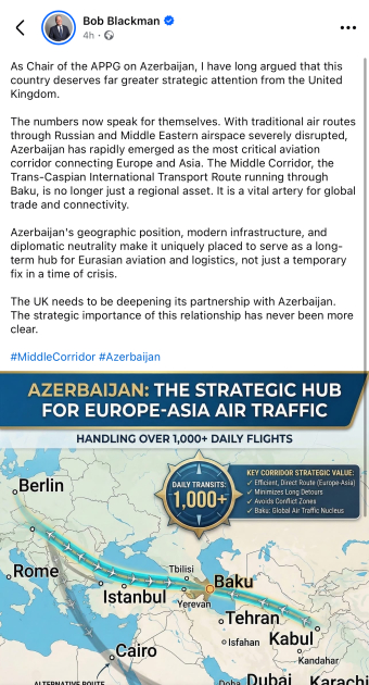 Bob Blekmen: Azərbaycan Avropa ilə Asiya arasında mühüm nəqliyyat və logistika qovşağına çevrilir