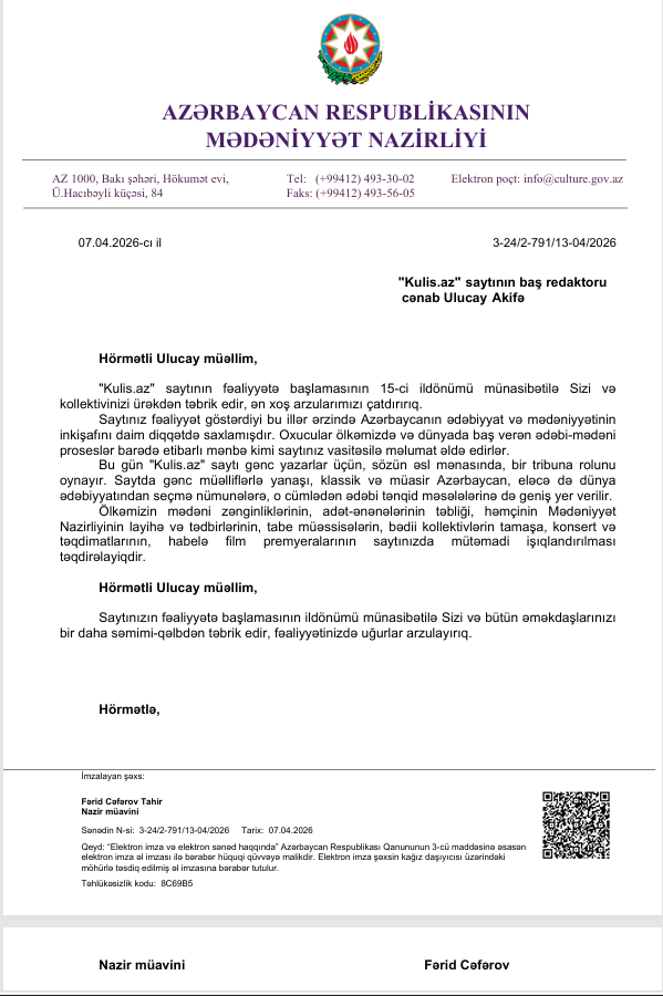 Mədəniyyət Nazirliyi Kulis i 15 illik yubileyi münasibətilə təbrik etdi