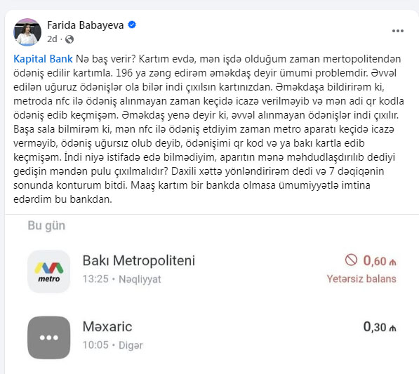“Əgər ödəniş uğurlu olsaydı, turniket keçidə icazə verərdi. Keçidə icazə verilməyibsə və mən alternativ üsulla keçmişəmsə, istifadə etmədiyim gedişin pulu niyə tutulmalıdır?” – deyə Fəridə Babayeva sual edir.