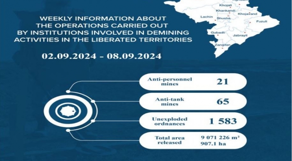 İşğaldan azad edilmiş ərazilərdə Azərbaycan Respublikasının Minatəmizləmə Agentliyi (ANAMA) tərəfindən icra olunan əməliyyatlar barədə həftəlik məlumat (02.09.2024 - 08.09.2024) açıqlanıb.