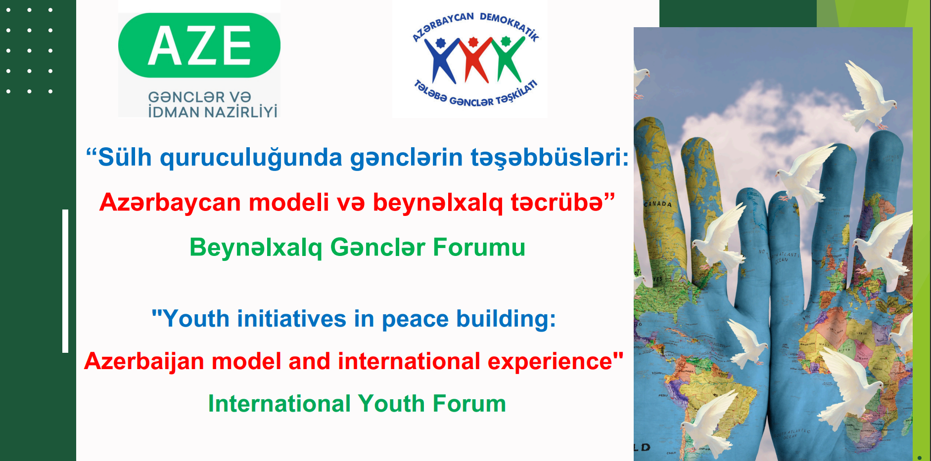 Azərbaycan Respublikası Gənclər və İdman Nazirliyinin maliyyə dəstəyi ilə “Аzərbaycan Demokratik Tələbə Gənclər Təşkilatı” İctimai Birliyi (ADTGT) “Sülh quruculuğunda gənclərin təşəbbüsləri: Azərbaycan modeli və beynəlxalq təcrübə” adlı Beynəlxalq Gənclər Forumu layihəsinin icrasına başlamışdır.