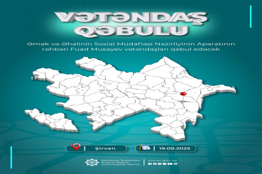 Əmək və Əhalinin Sosial Müdafiəsi Nazirliyinin Aparatının rəhbəri Fuad Musayev sentyabrın 19-da Şirvan şəhərində Şirvan şəhərinin və Hacıqabul rayonunun sakinlərini qəbul edəcək.