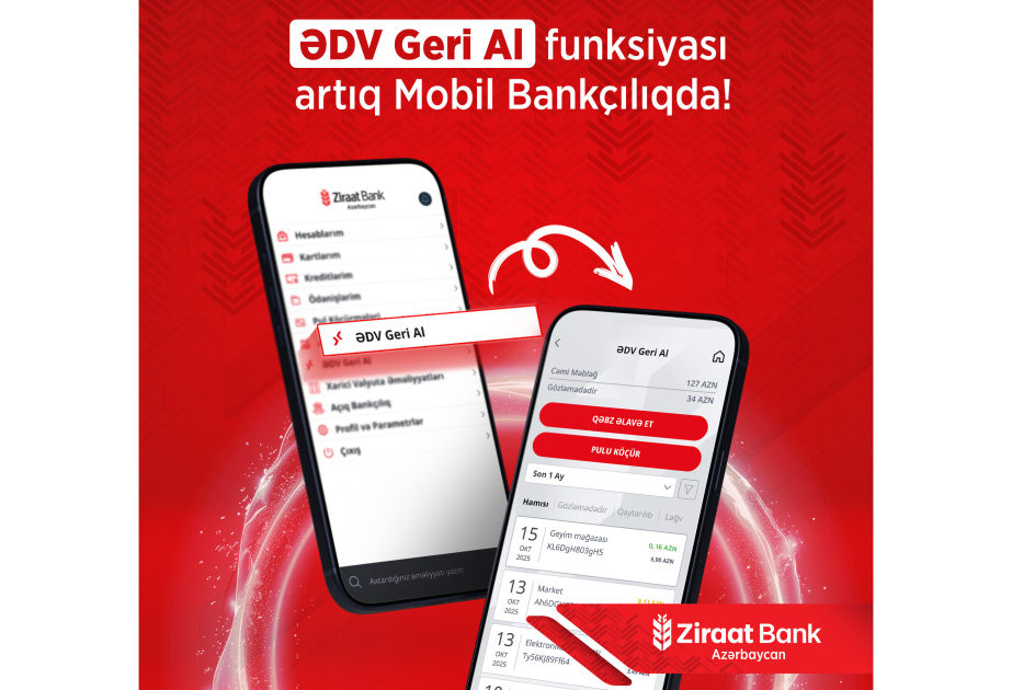 Bu yenilik sayəsində müştərilər Əlavə Dəyər Vergisinin (ƏDV) geri alınması ilə bağlı əməliyyatlarını birbaşa “Ziraat Bank Azərbaycan”ın mobil tətbiqi üzərindən, rahat və sürətli şəkildə həyata keçirə biləcəklər.