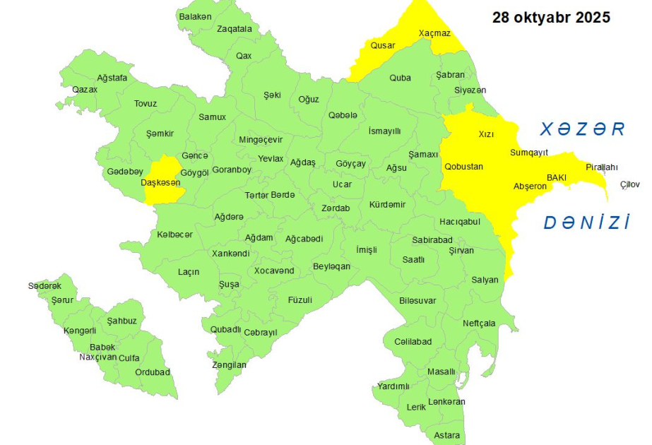 Milli Hidrometeorologiya Xidməti oktyabrın 28-də Bakıda və Abşeron yarımadasında, eyni zamanda, bəzi bölgələrdə gözlənilən küləkli hava şəraiti ilə bağlı sarı xəbərdarlıq verib.
