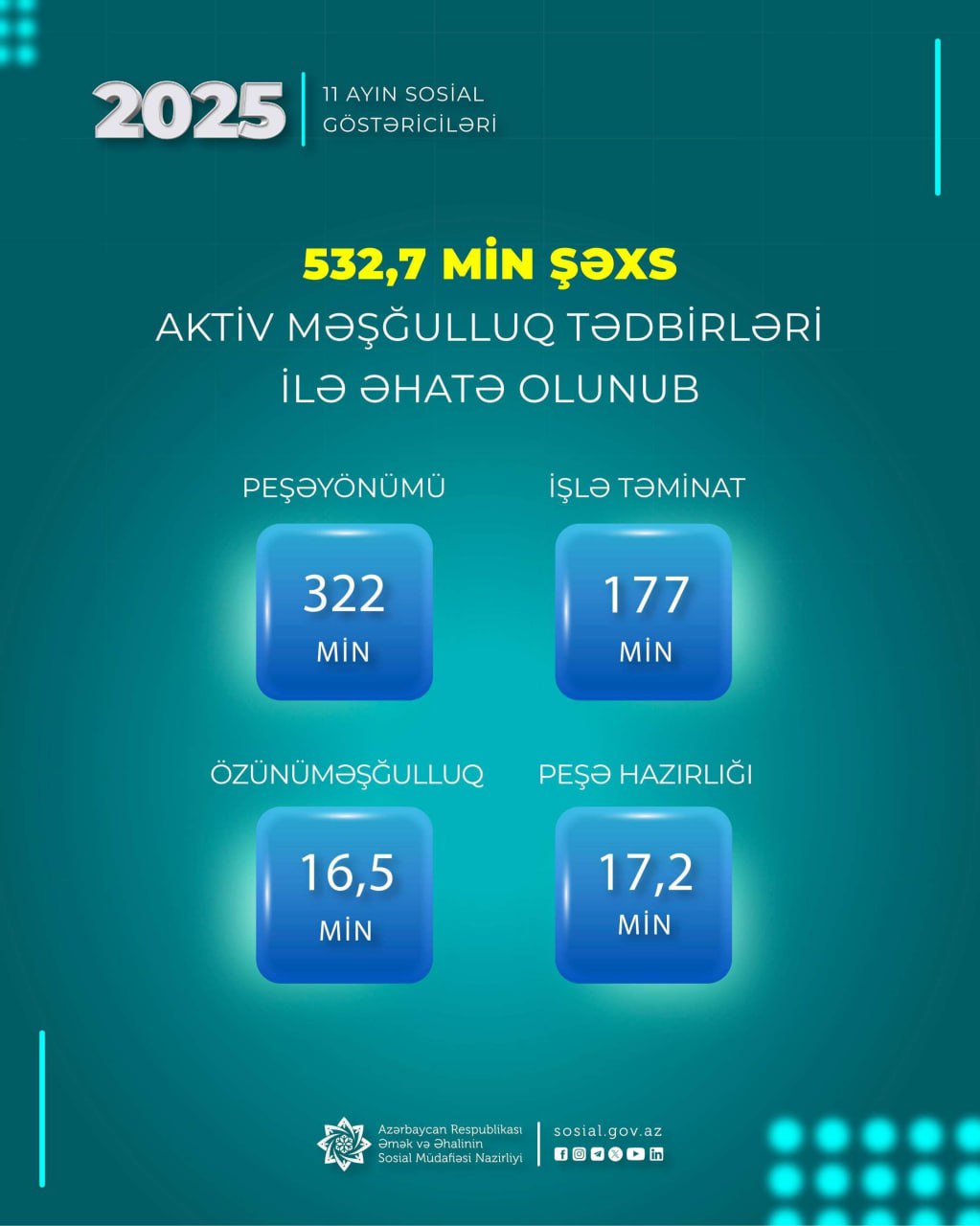 Əmək və Əhalinin Sosial Müdafiəsi Nazirliyinin məlumatına görə, onlardan 177 min şəxs münasib işlərlə təmin olunub, 16,5 min şəxs isə kiçik ailə təsərrüfatlarını yaratmaları üçün özünüməşğulluq proqramına cəlb olunub.
