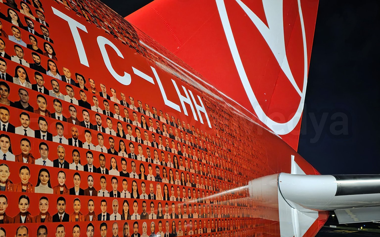 "Cebheinfo.az" Türkiyə mediasına istinadən xəbər verir ki, təyyarənin üzərində şirkətin aktiv və təqaüdə çıxmış işçiləri ilə birgə ümumilikdə 100 min nəfərin fotosu yer alıb.
