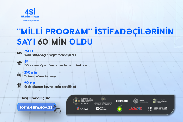 İqtisadiyyat Nazirliyinin tabeliyində Dördüncü Sənaye İnqilabının Təhlili və Koordinasiya Mərkəzi (4SİM) və Elm və Təhsil Nazirliyinin tabeliyində Təhsilin İnkişafı Fondunun (TİF) birgə icra etdiyi “4Sİ Akademiyası” çərçivəsində “Milli Proqram”a daha 7500 nəfər qoşularaq təlimlərə başlayıb. Vətəndaşlar altı həftə müddətində “Coursera” onlayn təhsil platformasında rəqəmsal bacarıqlar, süni intellekt, data analitikası, proqramlaşdırma, biznes və digər prioritet sahələr üzrə beynəlxalq səviyyəli təlimlərdən yararlanacaqlar.