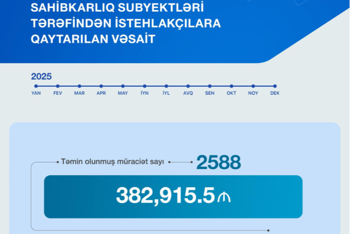 2025-ci il ərzində təmin olunmuş 2588 istehlakçı müraciəti əsasında ümumilikdə 383 min manatadək vəsait sahibkarlıq subyektləri tərəfindən istehlakçılara qaytarılıb.