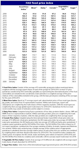 Birləşmiş Millətlər Təşkilatının Kənd Təsərrüfatı Təşkilatının (FAO-nun) Ərzaq Qiymətləri İndeksi 2026-cı ilin yanvarında süd məhsulları, ət və şəkər qiymətlərinin azalması səbəbindən ardıcıl beşinci ay düşübə