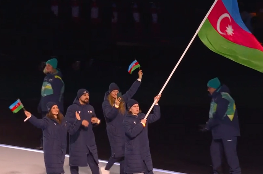 Azərbaycan millisinin bayraqdarları fiqurlu konkisürən Vladimir Litvintsev və dağ xizəyi üzrə idmançı Anastasiya Papatoma olub. İdmançıların stadiona çıxışı tamaşaçılar tərəfindən alqışlarla qarşılanıb.