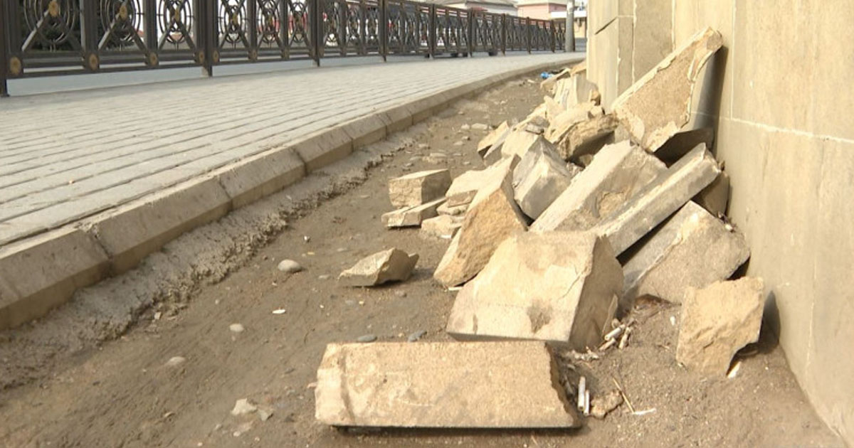 Səkiboyu səpələnən bu daşların hər biri təsadüfən və xoşbəxtlikdən hər hansı piyadadan yan keçib yerə düşmüş hasarın parçalarıdır.