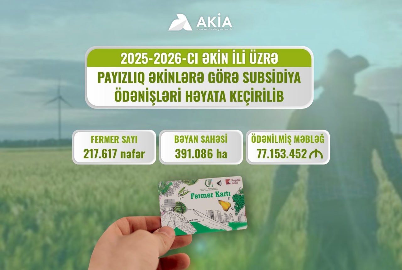 Kənd Təsərrüfatı Nazirliyinin məlumatına görə, payızlıq əkinlər üzrə 217 617 fermerin kartlarına 77,154 milyon manat məbləğində subsidiya köçürülüb. Ödənişlər təxminən 391 min hektar əkin sahəsini əhatə edir.