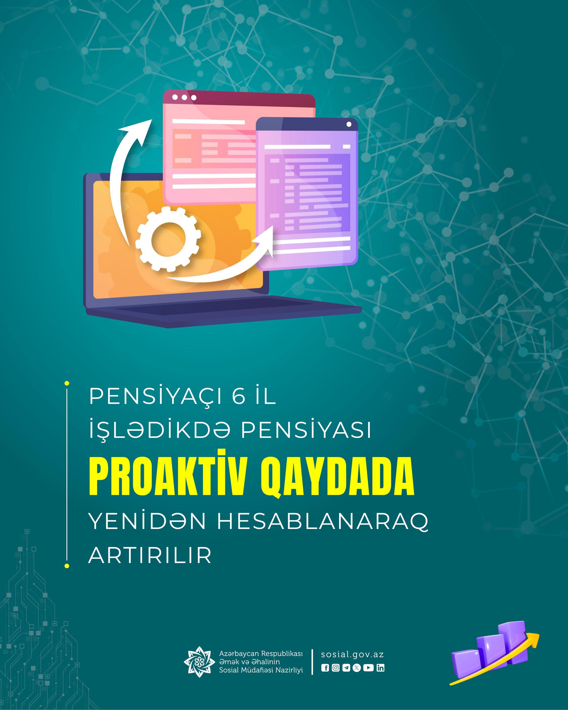Əmək və Əhalinin Sosial Müdafiəsi Nazirliyi tərəfindən qurulan proaktiv mexanizm yaınız pensiya təyinatının deyil, pensiyanın yenidən hesablanmasının e-sistem üzərindən avtomatik həyata keçirilməsinə imkan yaradıb.