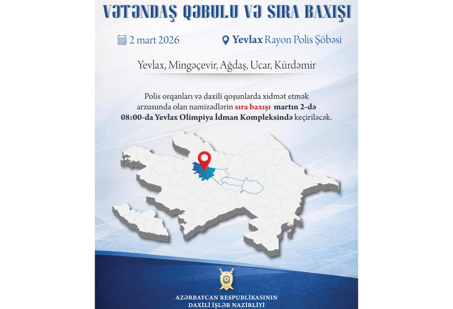 Polis orqanları və daxili qoşunlarda xidmət etmək arzusunda olan namizədlərin sıra baxışı martın 2-də 08:00-da Yevlax Olimpiya İdman Kompleksində keçiriləcək.