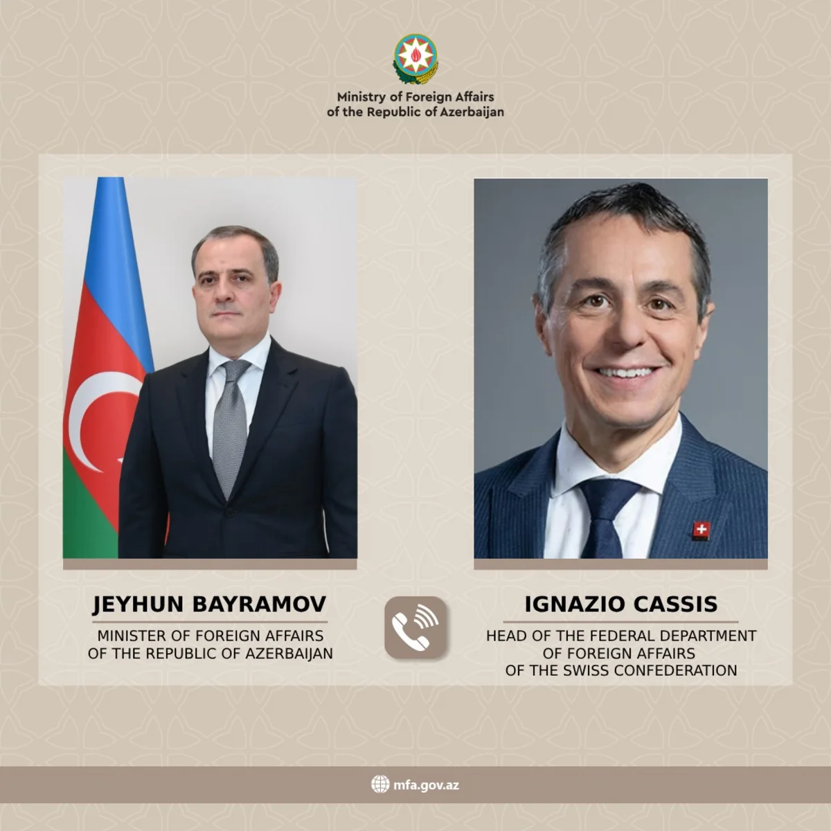 İsveçrə Konfederasiyasının federal xarici işlər naziri İqnasio Kasis Azərbaycan Respublikasının xarici işlər naziri Ceyhun Bayramova zəng vurub.