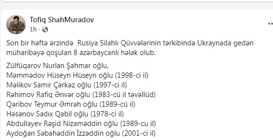 Rusiya Silahlı Qüvvələrinin tərkibində xidmət edən və Ukraynada gedən döyüşlərə qatılan daha 8 azərbaycanlı həlak olub.