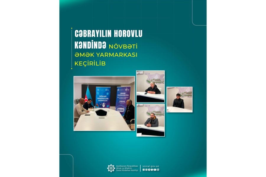 Əmək və Əhalinin Sosial Müdafiəsi Nazirliyinin tabeliyində Dövlət Məşğulluq Agentliyi və “19 saylı Tikinti Təmir İdarəsi” MMC-nin birgə təşkilatçılığı ilə Cəbrayıl rayonunun Horovlu kəndində növbəti əmək yarmarkası keçirilib.
