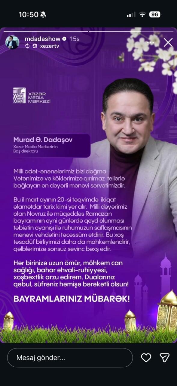 Hər birinizə uzun ömür, möhkəm can sağlığı, bahar əhval-ruhiyyəsi, xoşbəxtlik arzu edirəm. Dualarınız qəbul, süfrəniz həmişə bərəkətli olsun! Bayramlarınız mübarək!". \\yenisabah.az