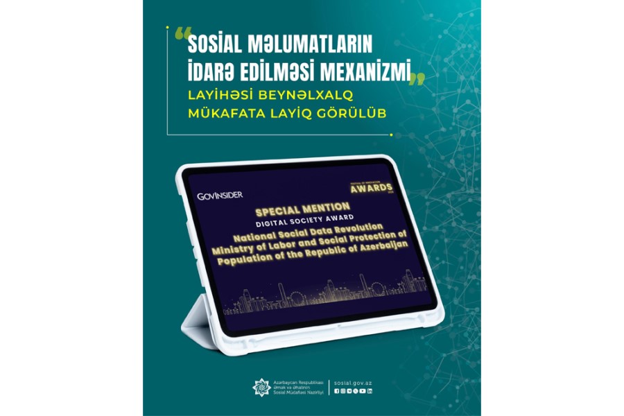 Əmək və Əhalinin Sosial Müdafiəsi Nazirliyinin “Sosial məlumatların idarə edilməsi mexanizmi” layihəsi Sinqapurun “GovInsider” təşkilatının “Festival of Innovation Awards 2026” müsabiqəsində yüksək qiymətləndirilib.