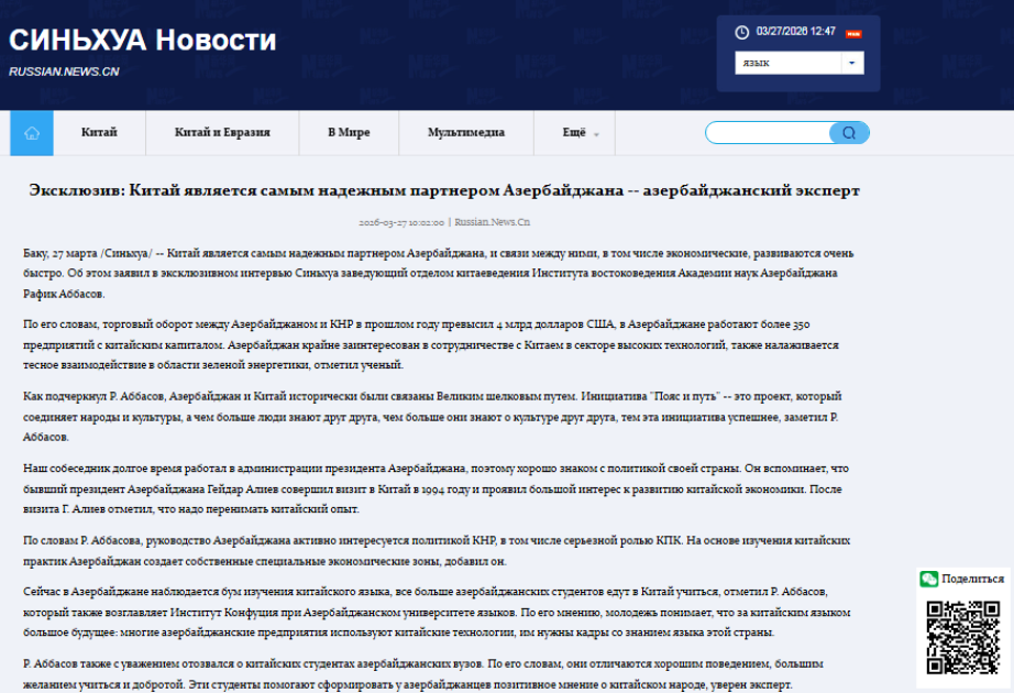 AZƏRTAC xəbər verir ki, bu fikirləri Sinxua agentliyinə müsahibəsində çinşünas alim, Azərbaycan Dillər Universitetinin Konfutsi İnstitutunun direktoru Rafiq Abbasov bildirib.