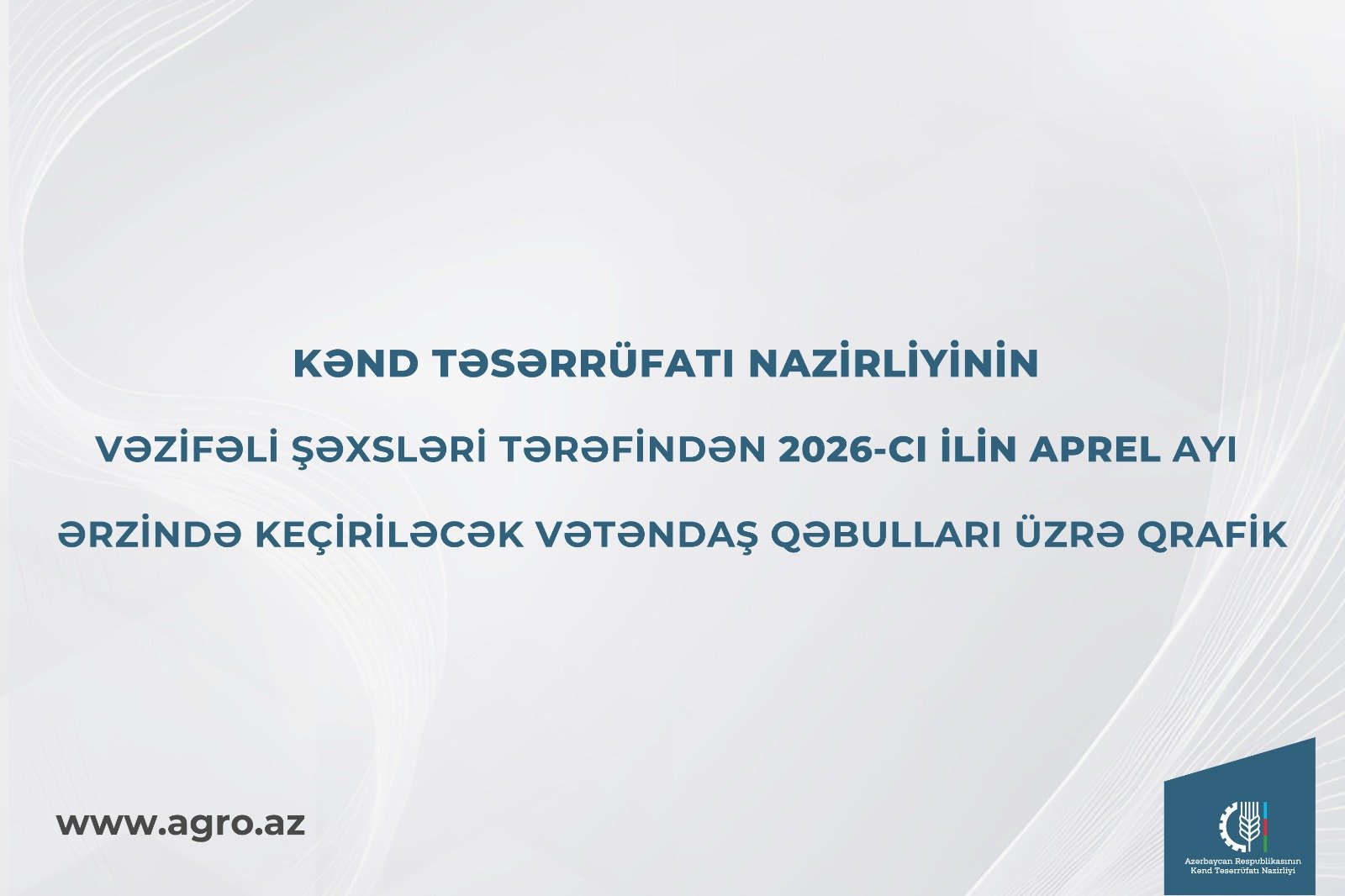 Kənd Təsərrüfatı Nazirliyinin vəzifəli şəxsləri tərəfindən 2026-cı ilin aprel ayı ərzində keçiriləcək vətəndaş qəbulları üzrə qrafiki təqdim edirik.