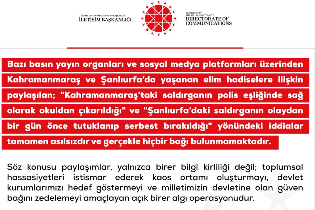Kahramanmaraşda silahlı hücum edən şəxsin polis tərəfindən məktəbdən sağ çıxarılması, Şanlıurfada isə təhsil müəssisəsinə hücum edənin hadisədən bir gün əvvəl həbs edilib azadlığa buraxılması barədə iddialar əsassızdır.