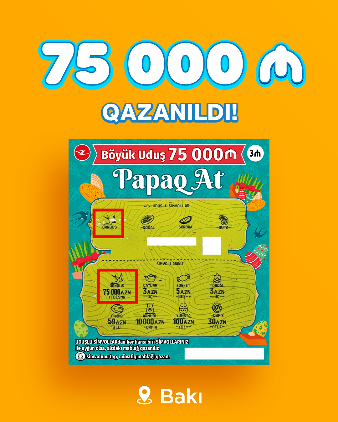 Qiyməti 3 manat olan “Papaq at” lotereyasında bir ədəd biletdə böyük uduş 75 000, daha 17 biletdə isə 10 000 manat qazanmaq şansı var.Biletlər Novruza özəl limitli sayda olduğu üçün şansınızı yoxlamağa tələsin.