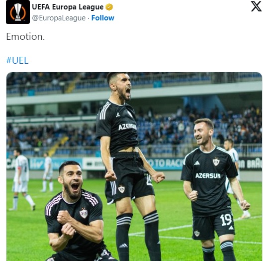 UEFA Avropa Liqası “X” sosial şəbəkəsindəki hesabında Azərbaycanın “Qarabağ” klubu ilə bağlı paylaşım edib. SİA xəbər verir ki, paylaşımda “emosiya” sözü yazılıb və “Qarabağ”ın oyunçularının fotosu yer alıb.