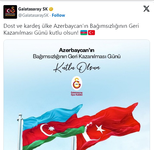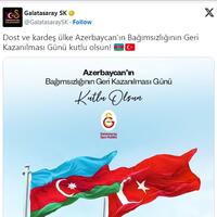 “Qalatasaray” futbol klubu Azərbaycanı 18 oktyabr - Dövlət Müstəqilliyinin Bərpası Günü münasibəti ilə təbrik edib. SİA xəbər verir ki, Türkiyə klubu bununla bağlı “X” sosial şəbəkəsindəki hesabında paylaşım edib.