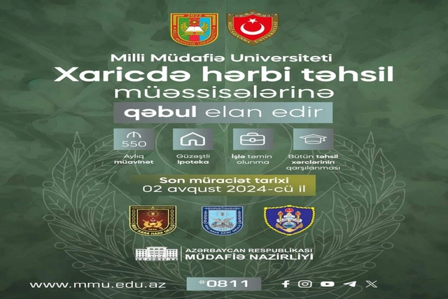 Məlumata görə, tələblərə cavab verən namizədlər avqustun 2-dək xaricdə hərbi təhsil üzrə ilkin qeydiyyat forması (mmu.edu.az/qeydiyyat) üzərindən müraciət edə bilərlər.