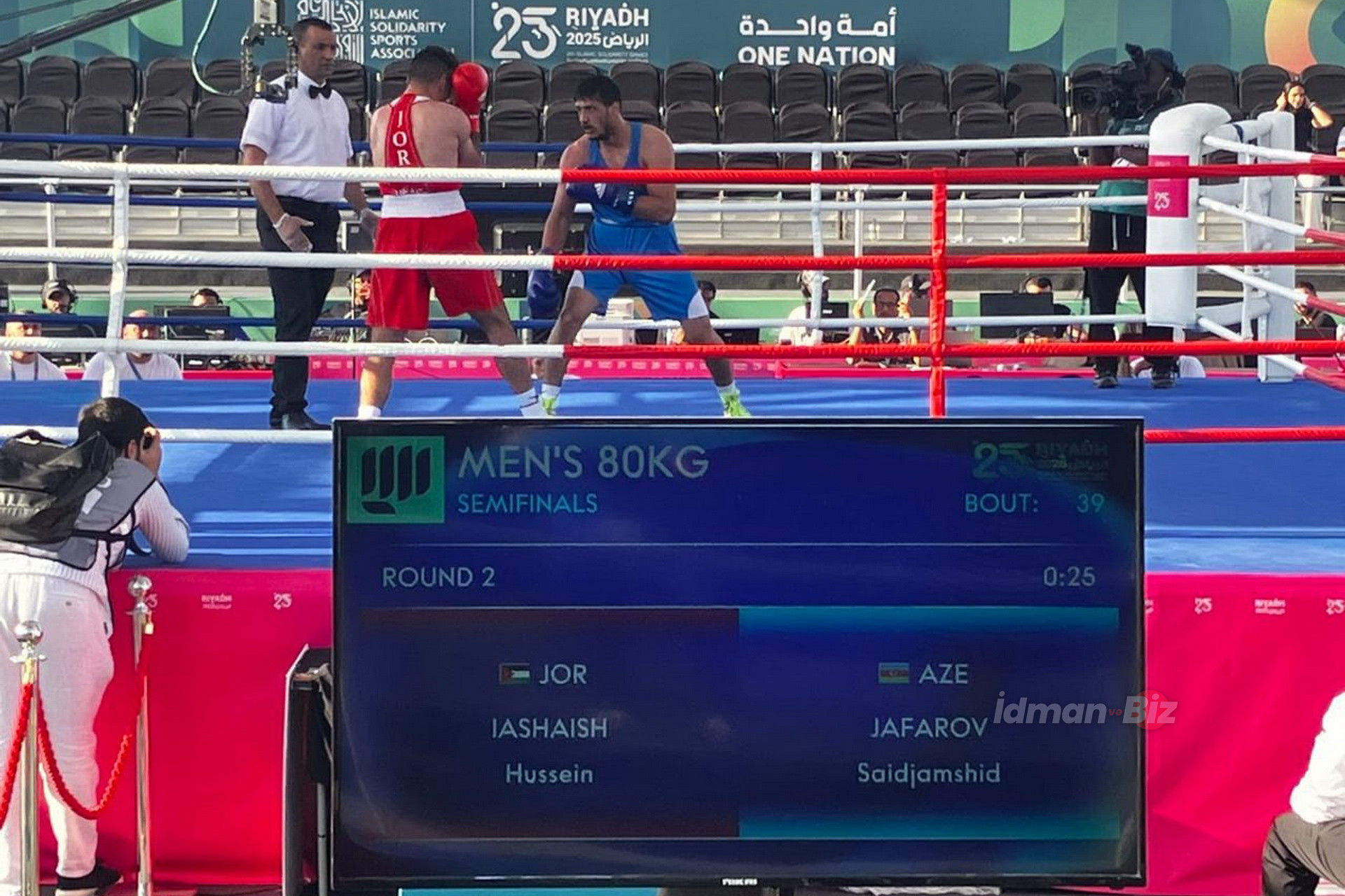 İdman.Biz xəbər verir ki, 80 kq çəki dərəcəsində Azərbaycanı təmsil edən boksçumuz Səidcəmşid Cəfərov yarımfinalda İordaniya təmsilçisi Hüseyn Yaşaş ilə qarşılaşıb.