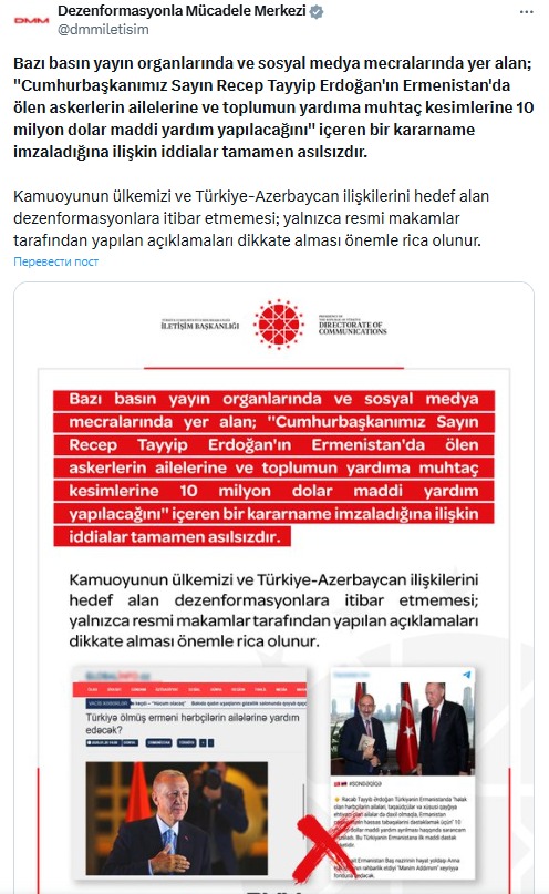 Məsələ ilə əlaqədar Türkiyə Prezident Administrasiyası yanında fəaliyyət göstərən Dezinformasiyaya Qarşı Mübarizə Mərkəzi rəsmi mövqe ortaya qoyub. Qurumun yaydığı açıqlamada qeyd olunub ki, bu məzmunlu məlumatlar tamamilə uydurmadır və heç bir faktiki əsas daşımır. Bildirilib ki, Prezident Ərdoğan tərəfindən belə bir qərar qəbul edilməyib və Ermənistanla bağlı maliyyə yardımı nəzərdə tutan hər hansı rəsmi sənəd mövcud deyil.