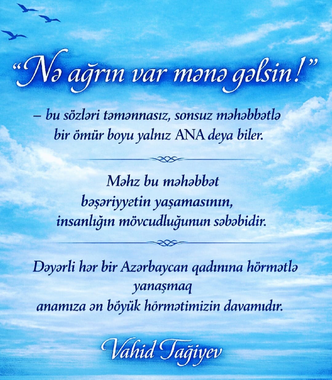 “Nə ağrın var mənə gəlsin!” — bu sözləri təmənnasız, sonsuz məhəbbətlə, bir ömür boyu yalnız ANA deyə bilər. Məhz bu məhəbbət canlı bəşəriyyətin davamlılıq, yaşam və mövcudluq səbəbidir.