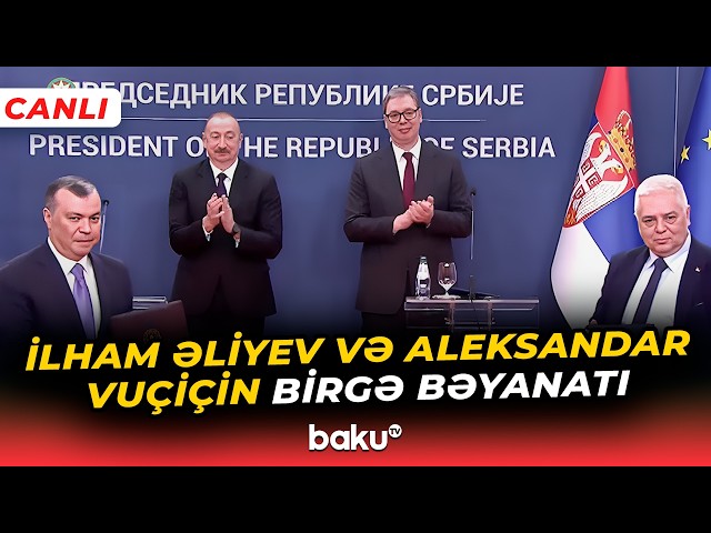 Azərbaycan Prezidenti İlham Əliyev və Serbiya Prezidenti Aleksandar Vuçiç mətbuata bəyanatla çıxış edirlər.