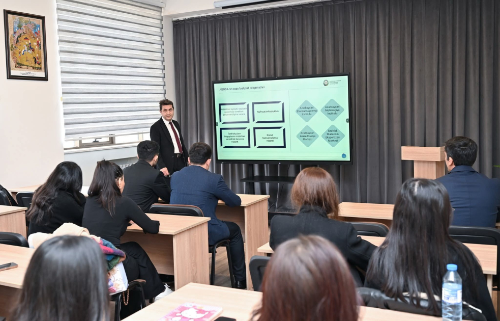 İnteraktiv formatda keçirilən açıq dərs zamanı tələbələrə real təcrübədən nümunələr təqdim olunub, onları maraqlandıran suallar cavablandırılıb.