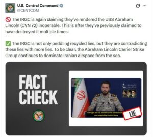 NOCOMMENT.az xəbər verir ki, rəsmi bəyanatda SEPAH-ın dezinformasiya kampaniyası ifşa olunub: “SEPAH yenidən ‘USS Abraham Lincoln’ (CVN-72) aviadaşıyıcısını sıradan çıxardığını iddia edir. Onlar daha əvvəl də bu gəminin ‘məhv edildiyini’ dəfələrlə bəyan etmişdilər. SEPAH nəinki köhnə yalanları tirajlayır, həm də özü-özünü təkzib edən yeni iddialar irəli sürür.”